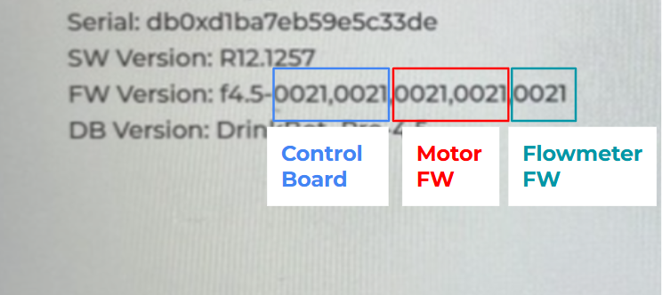 Start STEP 6. (Root cause: The control board / the power supply wires disconnected.) - Result 2 - Any of the flowmeter or motor FW version displays "0000".